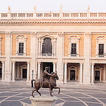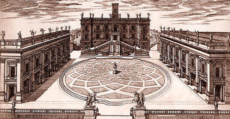 La piazza del Campidoglio nel suo aspetto attuale fu progettata intorno alla metà del Cinquecento da MichelangeloBuonarroti.
